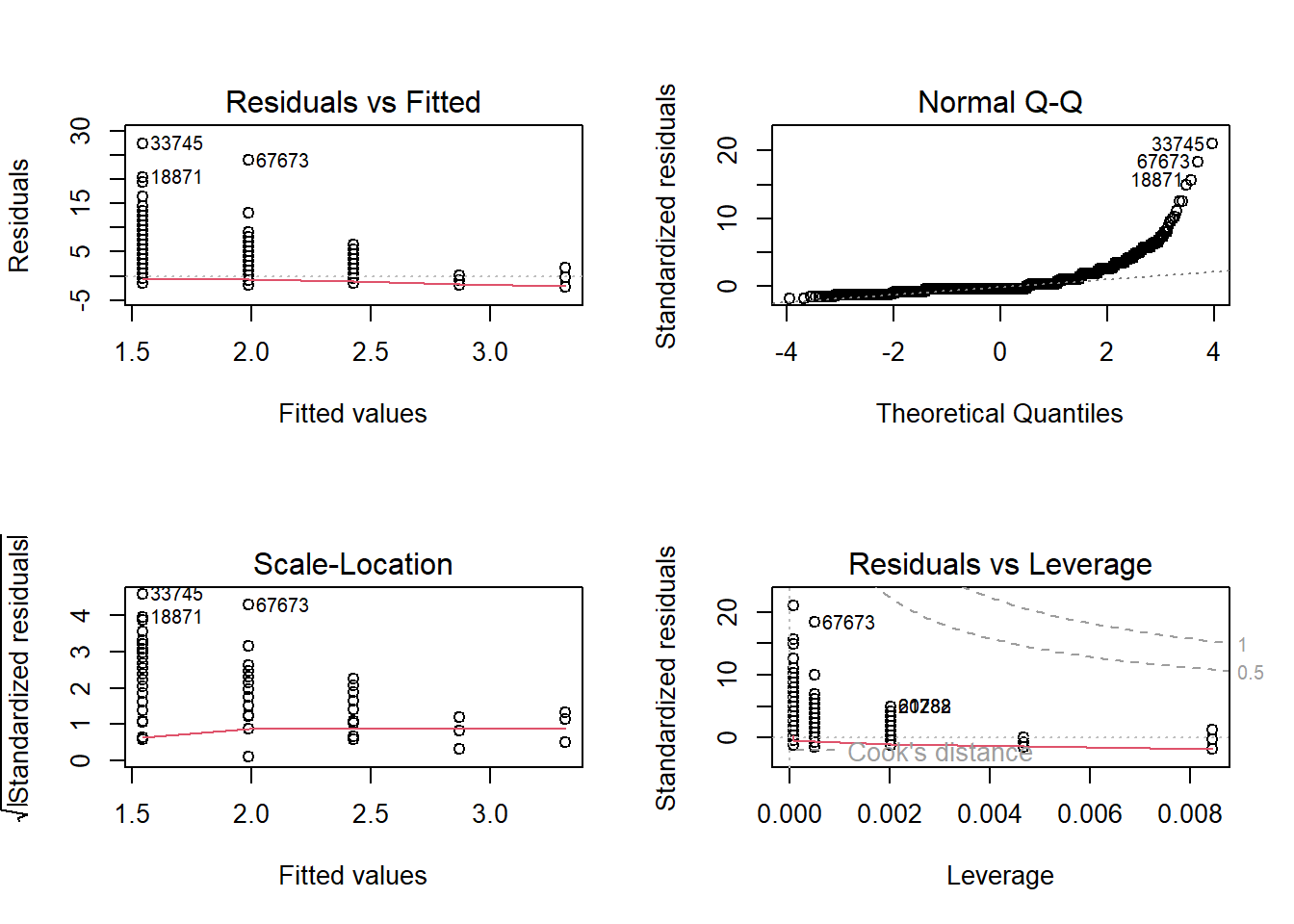 Residuals show bias, as they are distributed between the two first values. If we consider the “vehicles” variable as categorical then we can also omit this test